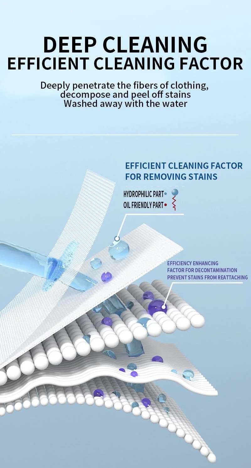 Engineered with high-efficiency nonionic surfactants, this emulsifier dives deep into fabric fibers to break down oil, sweat, sebum, collar grime, and food stains, restoring your clothes to a like-new freshness.