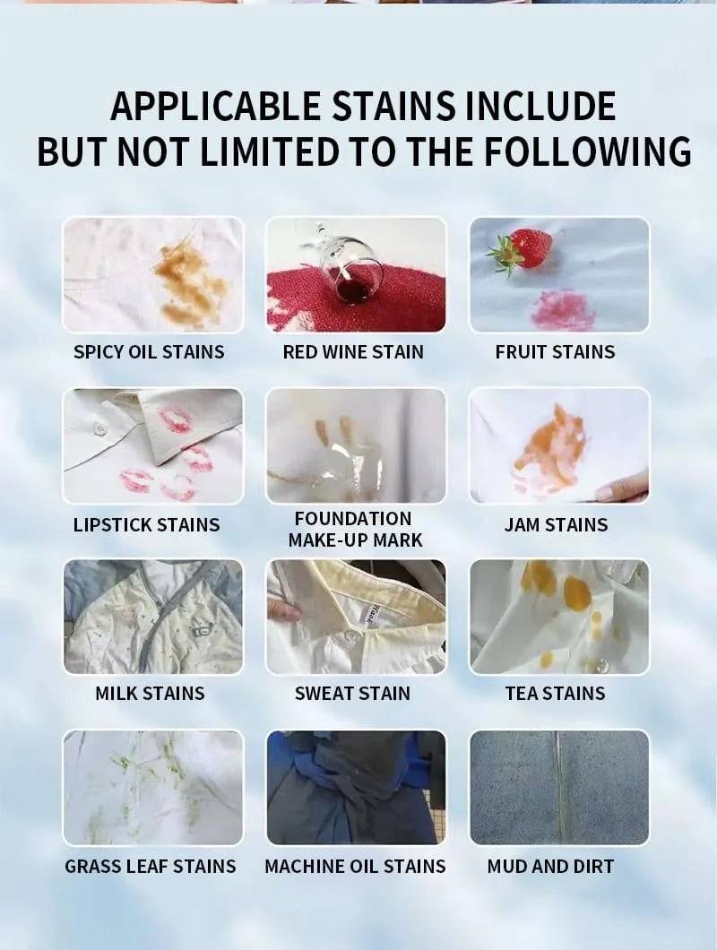 Easily removes: yellowed collars, sweat marks, oil stains, makeup smudges, wine spills, food drips, and daily dirt.