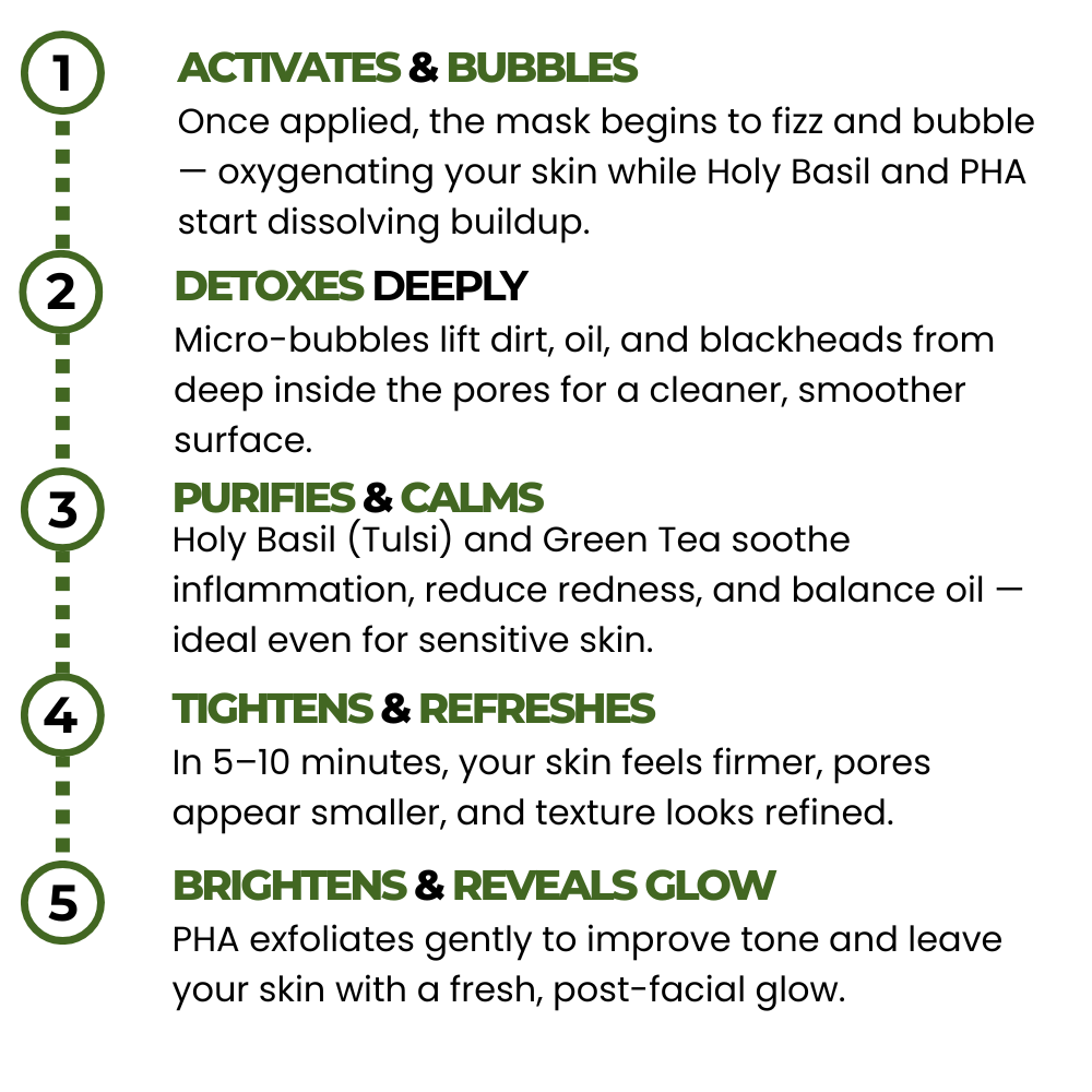 Holy Basil (Tulsi), carbonated water, and gentle PHAs detoxthe pores while keeping the skin barrier calm and hydrated- leaving your skin smooth, clean, and fresh after everyuse